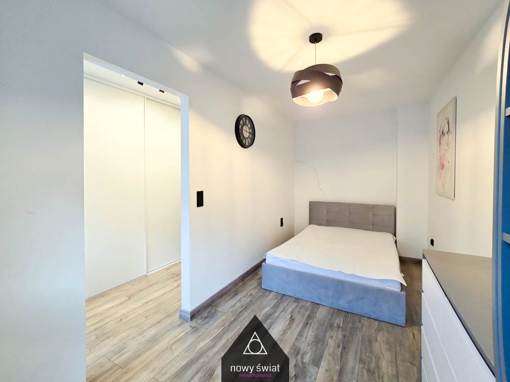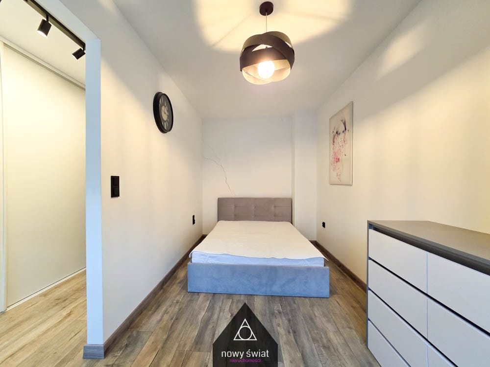 Tak, to jeden z głównych atutów tej oferty. Oprócz standardowych mebli, sypialnia posiada wydzieloną garderobę z pojemną szafą, co eliminuje problem braku miejsca na ubrania, deskę do prasowania czy odkurzacz.